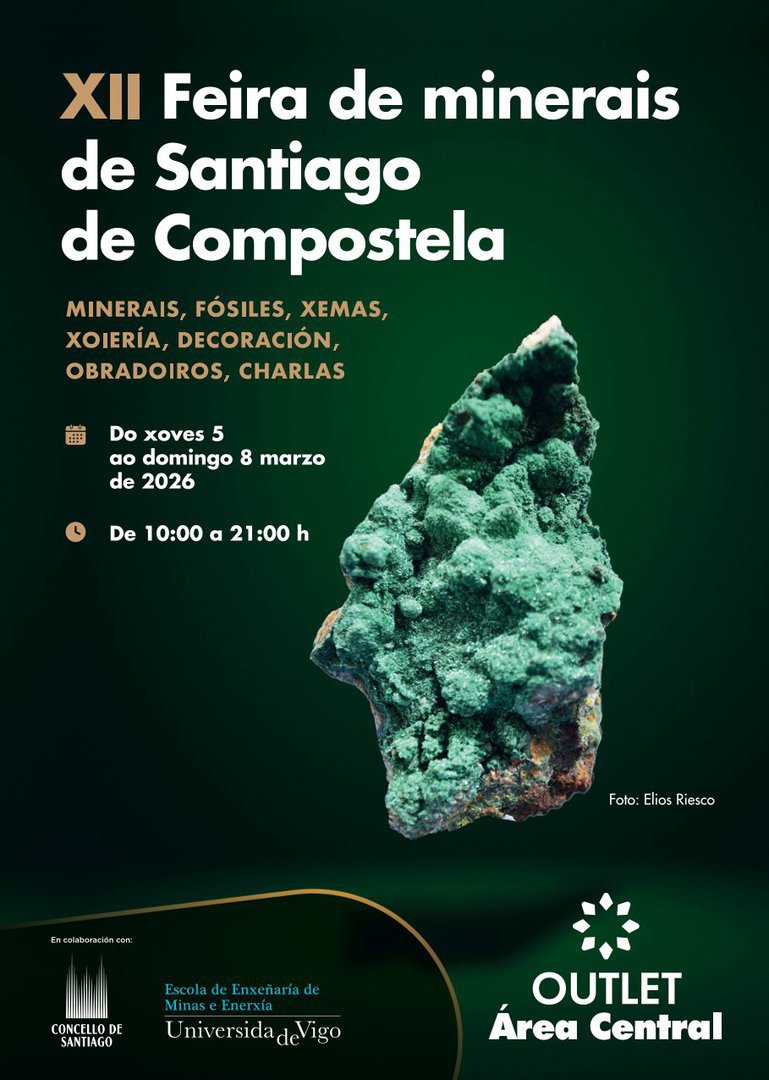 Desde el jueves 2 al domingo 5 de marzo se va a celebrar la IX edición de la Feria de Minerales de Santiago de Compostela en Área Central. La feria cuenta con la asistencia de 30 expositores de varios países, con 150 metros de exposición. Al igual que en anteriores ediciones se llevarán a cabo diferentes actividades, gratuitas, de carácter didáctico para todos los asistentes.