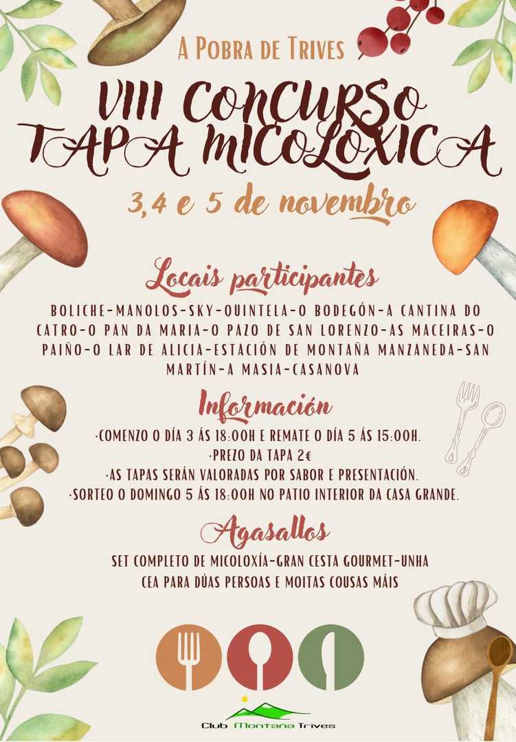 El día 4 se llevará a cabo una charla en el Auditorio Julio Vazquez de Trives a cargo de la asociación micológica “ Os Cogordos” para posteriormente salir al campo en busca de ejemplares, una vez finalizada la salida al campo se montará una exposición en el interior de patio del Pazo de la Casa Grande Trives hasta el domingo a las 18:00 horas. Durante todo el día sigue el concurso de tapas.
